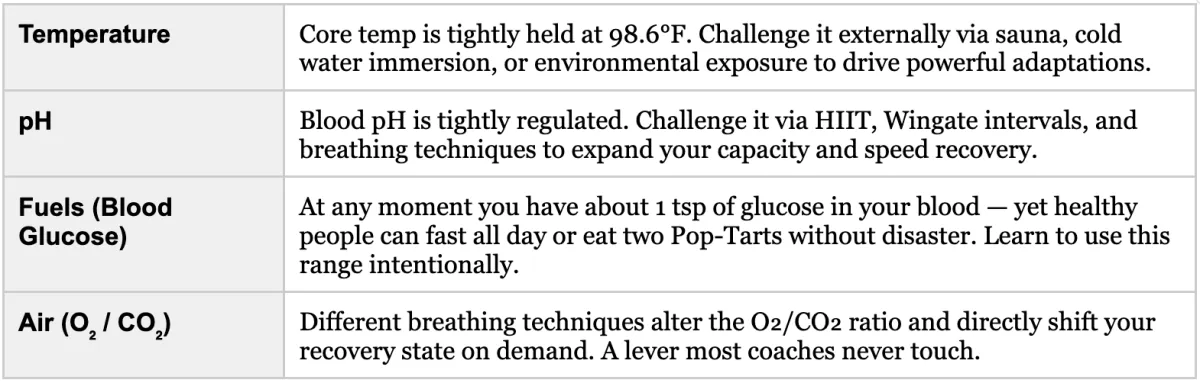 Physiologic Flexibility is your body’s ability to expand its end points and switch efficiently across four tightly regulated homeostatic systems. The goal isn’t to eliminate stress — it’s to increase the range of conditions you can handle, then recover from rapidly.